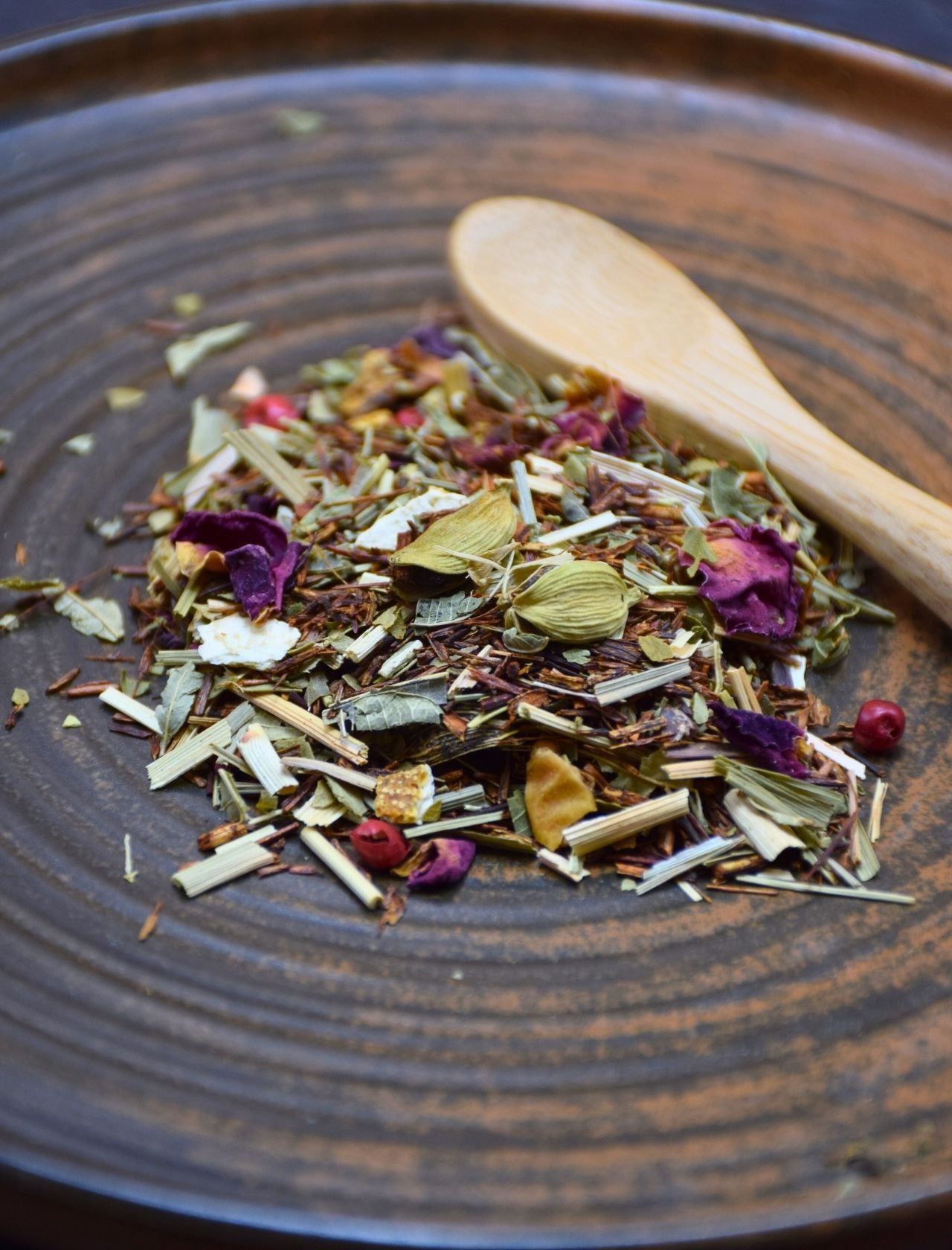 Rooibos torréfié d'Afrique du Sud, arômes vanille, fraise, et fruits rouges, fleurs de bleuet et de souci, huile essentielle naturelle de bergamote.
